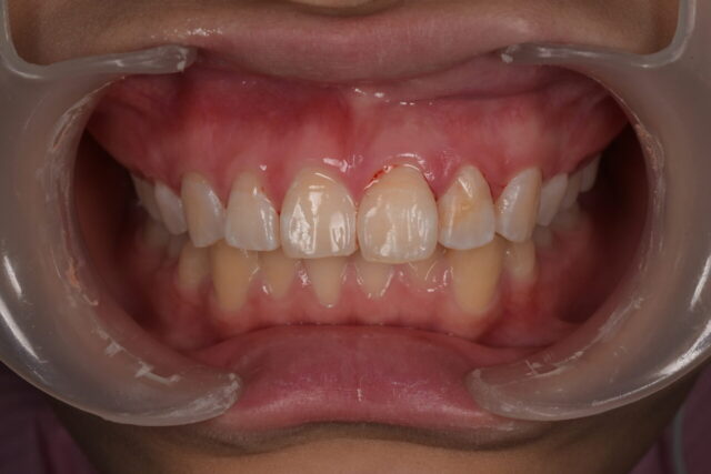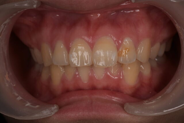 まずは治療前のお写真をご覧いただくと、歯の色味自体がやや濃く、その中で白い部分が余計に目立ってしまう状態でした。