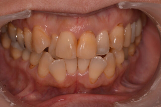 主訴 「全体的にしっかりと噛めるようになりたい。あわせて、前歯の形態・色彩を整えたい」とお悩みで、福岡市西区・姪浜エリアからご来院された患者様の症例です。他院では複数の抜歯とインプラントを提案されたものの、「可能な限り天然歯を保存したい」との強いご希望がありました。 治療 治療内容:自家組織を活用した包括的歯科治療(フルマウス)